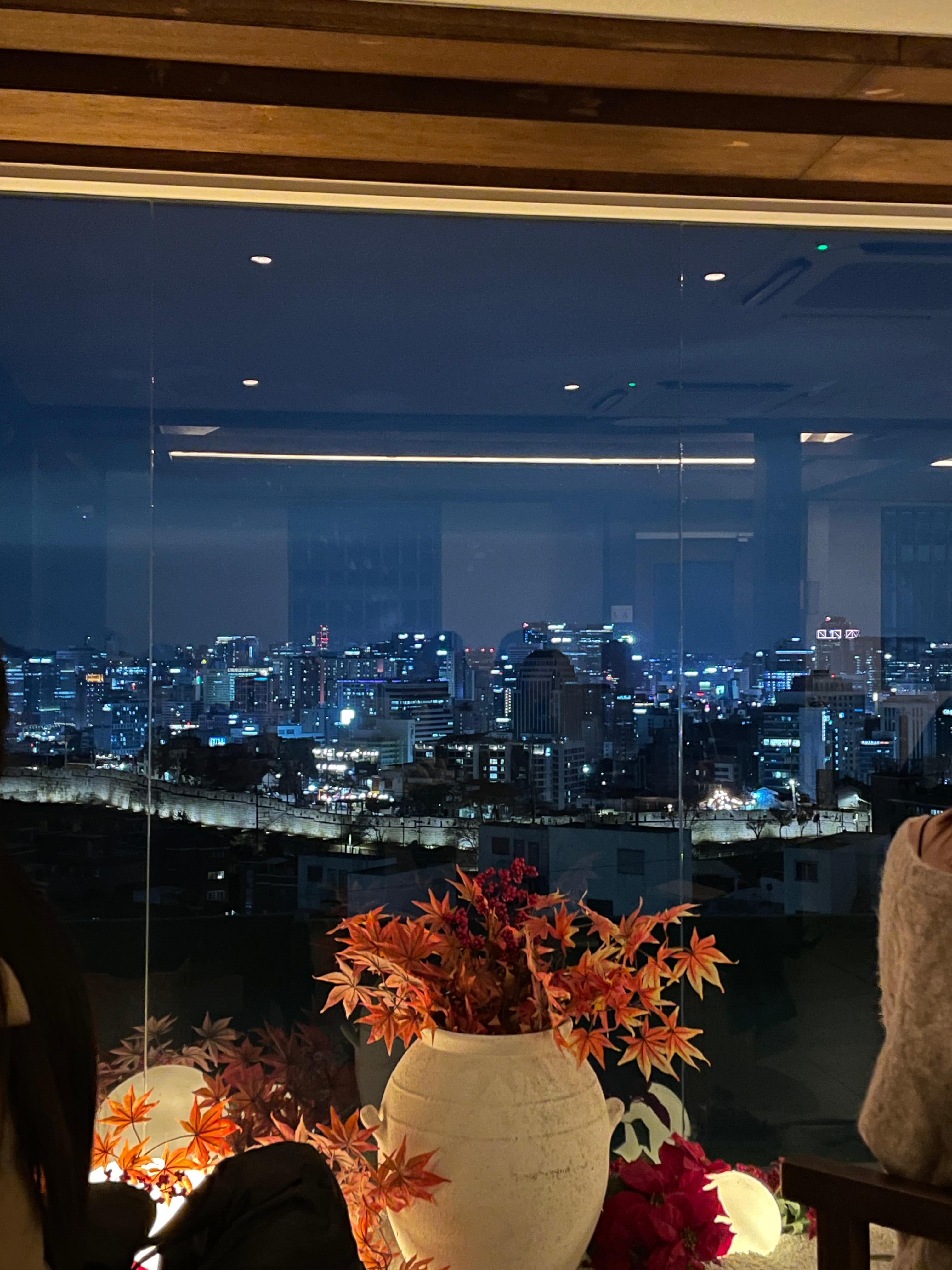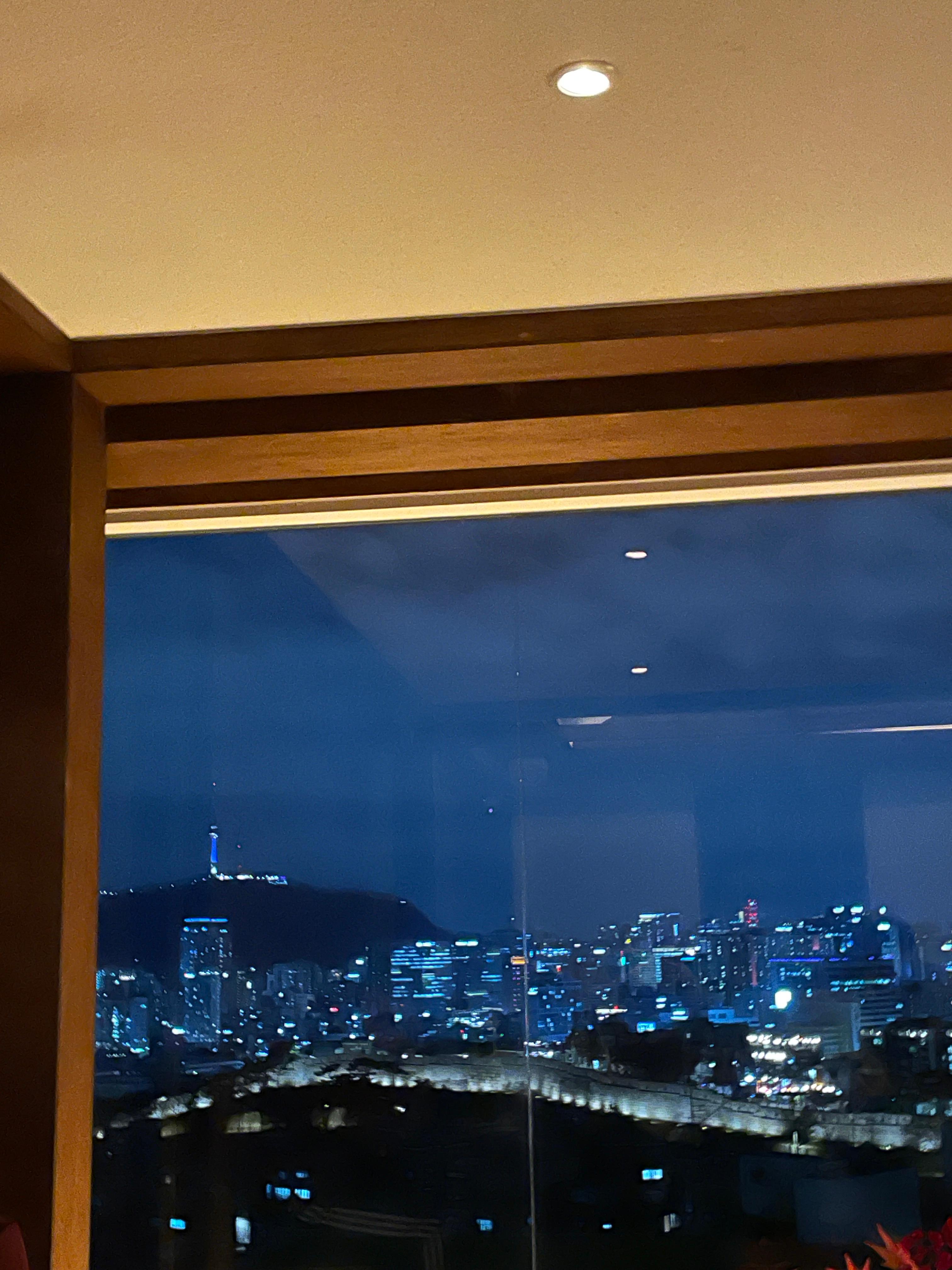 주문 후 1층에서 기다렸다가 바로 픽업해서 다시 2층으로 올라왔다. 일단 먹기 전에 처음 들어왔을 때 감탄했던 뷰를 구경하였다. 다른 분들이 올린 후기 사진 중 낮엔 밖에 있는 초록색 옥상이 보여 조금 방해되는 것 같았는데 우린 깜깜한 밤에 가서 야경이 눈에 띄어 그런지 초록 옥상이 보이지도 않았고 예쁘고 좋았다.