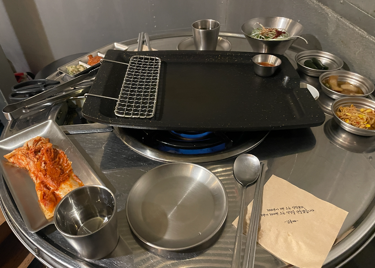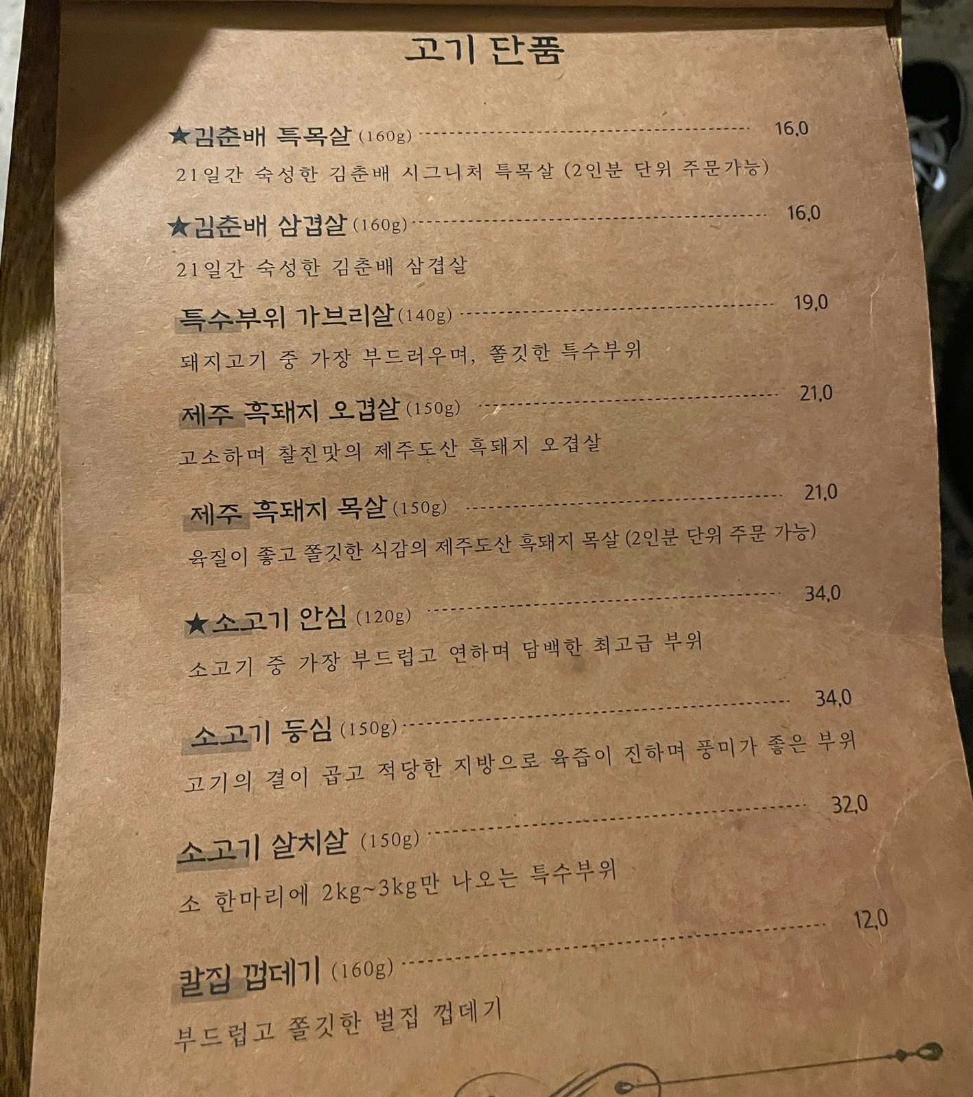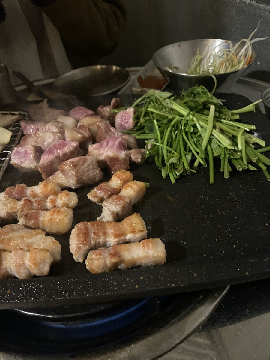 메뉴는 소고기, 돼지고기로 준비되어 있고 세트와 단품이 있어 원하는 대로 선택하면 좋을 거 같다. 그리고 껍데기도 있는데 껍데기는 현재 구글 리뷰 작성 시 1인분을 서비스로 주신다. (추후 변경될 수 있음) 마지막에 뭔가 아쉽다면 리뷰 작성 후 직원분께 말씀하셔서 껍데기를 맛보면 완벽한 한 끼가 될 것이다. 된장찌개는 무조건 시키는 것을 추천한다. 고기의 느끼함도 잡아주고 공깃밥이 함께 나와 같이 먹음 정말 맛있음!! 그리고 콜키지가 프리라는 점 참고!! 우리는 둘이 가서 목살 2인 삼겹 1인 된장찌개, 물냉면, 껍데기 1인분(구글 리뷰 서비스) 먹었는데 양이 많았지만 맛있기도하고 분위기가 좋다보니 수다를 떨며 다 먹고 나왔다.